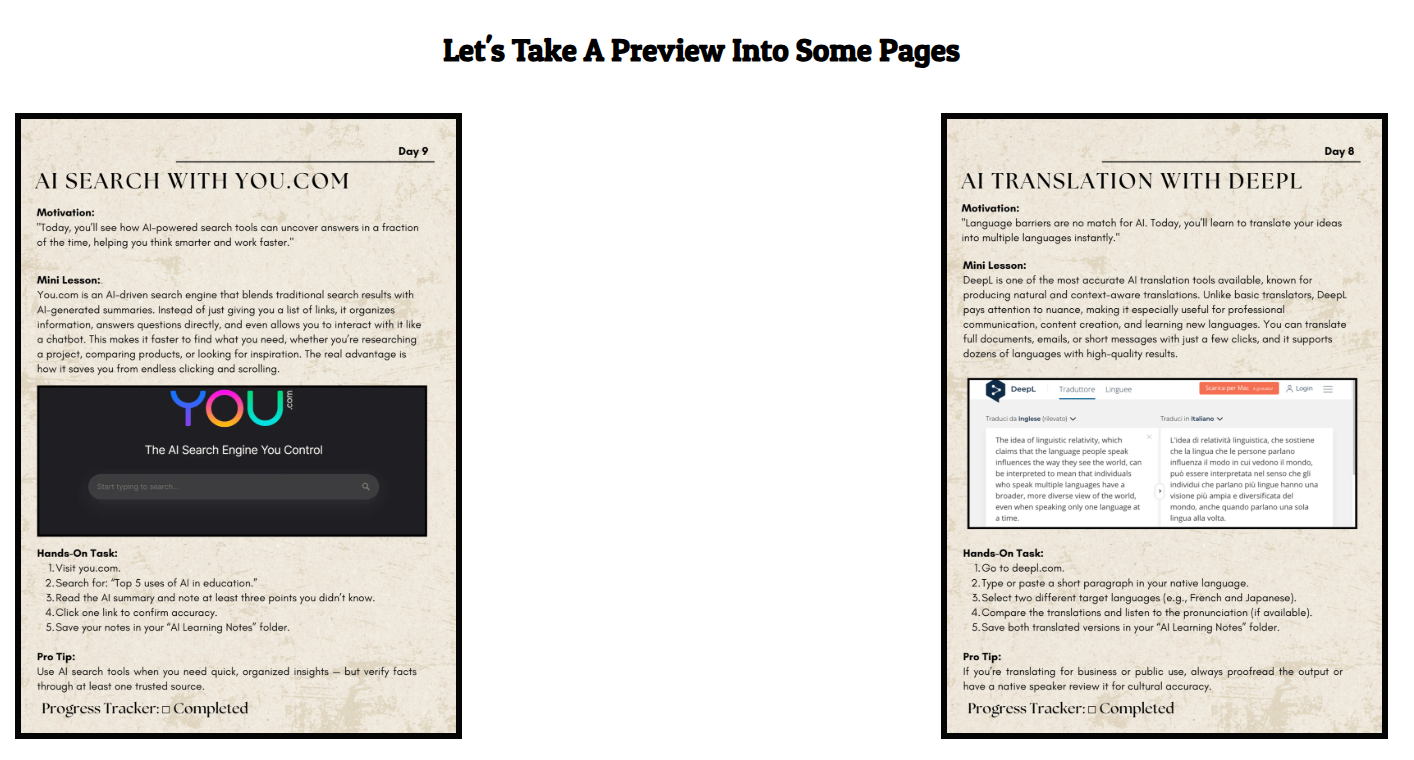 It’s a hands-on, step-by-step guide that walks you through AI tools in bite-sized lessons, helping you build skills you can use immediately in your career, business, or personal projects.