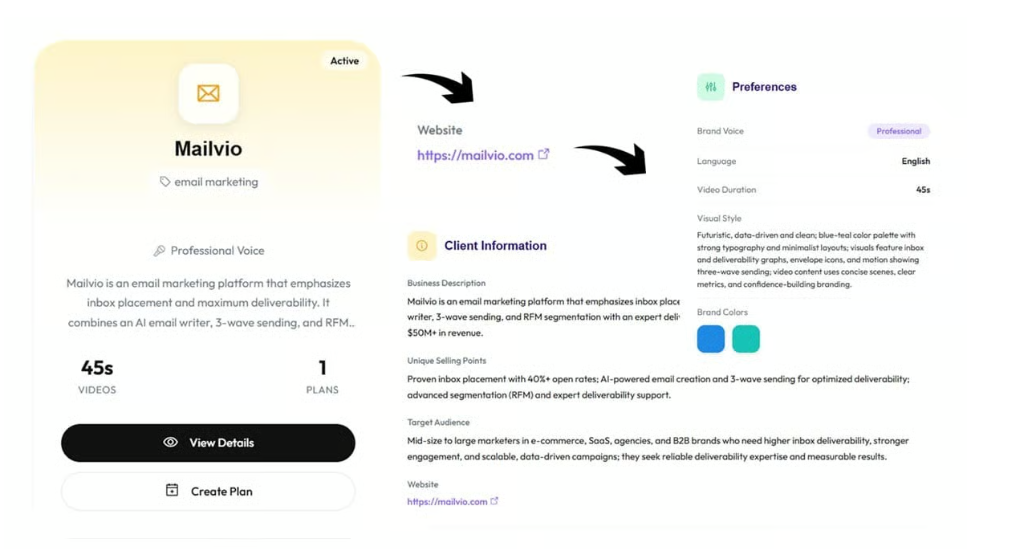 - Step 1: AI Profile Generation (2 mins) Paste the client’s website URL. The AI analyzes and extracts brand voice, target audience, USP, and style. Result: A complete brand profile that replaces 3 weeks of questionnaires.